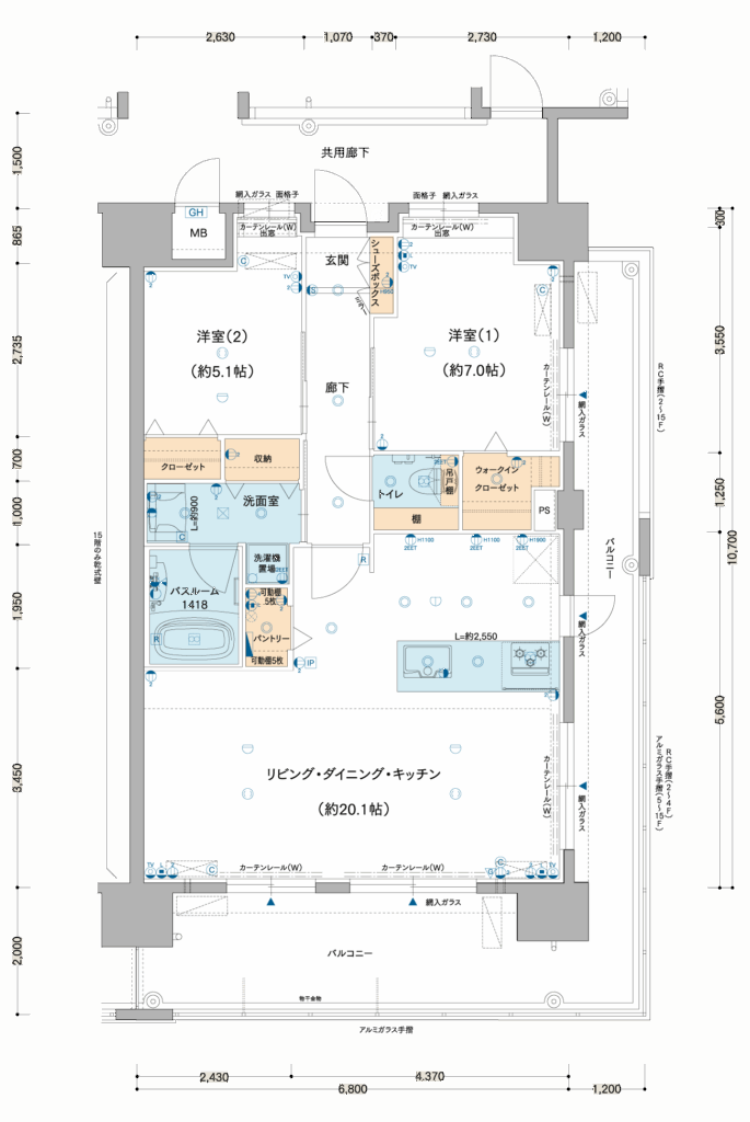 約20.1帖の広々なリビング・ダイニング・キッチン。開放感があり、家具の配置にもゆとりがあります。家族団らんや来客をお迎えするにも十分な広さです。