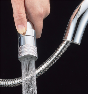 吐水口先端部を回すことでシャワーと整流の切り換えができ、本体左側には手を触れずに吐水・止水操作ができるセンサーを搭載。 ホースを引き出して使うことができるので、シンクのお掃除にも便利です。